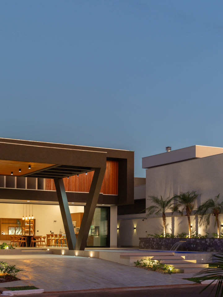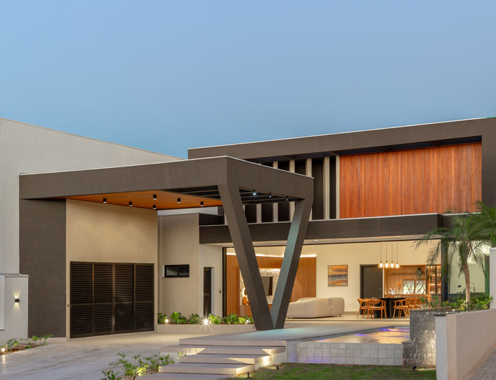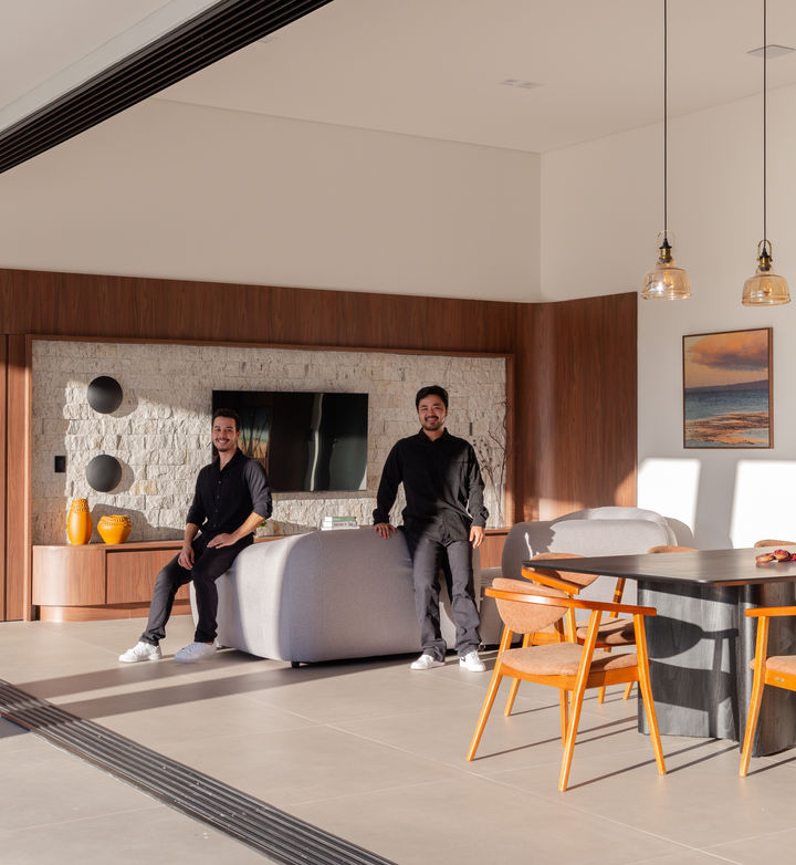 A residência possui quatro suítes e foi concebida para maximizar a convivência entre familiares e amigos, com integração total entre áreas internas e externas de lazer. A linguagem arquitetônica é contemporânea, destacando continuidade visual e espacial, garantindo que todos os ambientes se conectem de forma fluida.