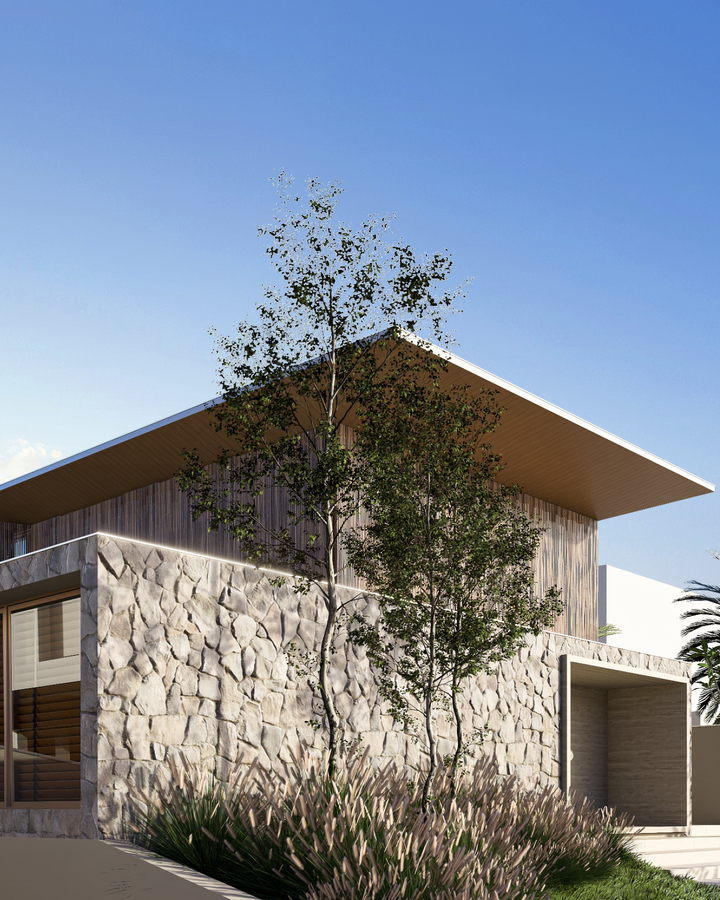 Na fachada, a combinação dos brises em bambu e da pedra natural se integra ao paisagismo, promovendo uma atmosfera acolhedora e sofisticada. O acesso lateral à garagem subterrânea se funde de forma sutil à estética da casa, reforçando o equilíbrio entre forma e função.