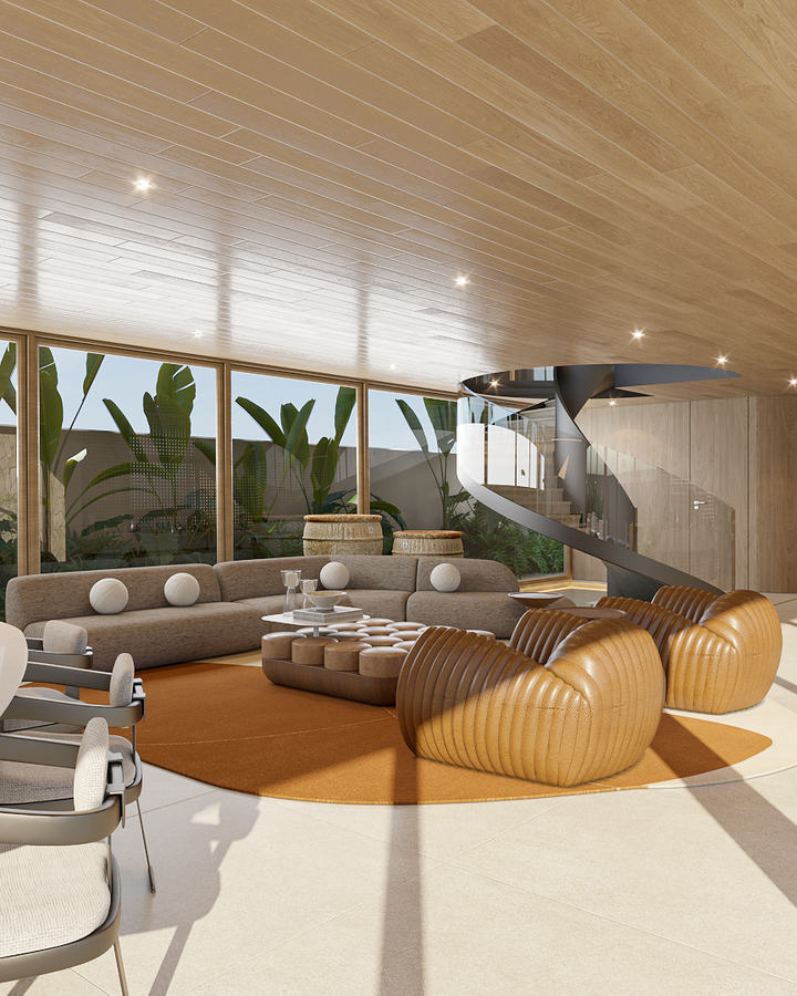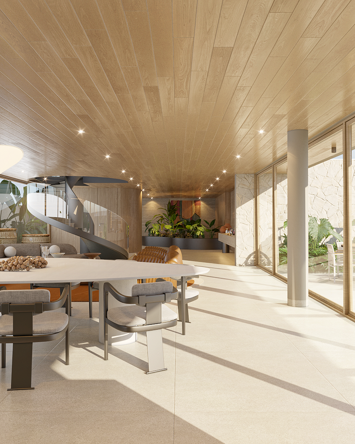 A escadaria iluminada convida à descoberta do interior, cercada por floreiras que aproximam o verde do cotidiano. A caixaria em travertino, com porta mimetizada e puxador em pedra orgânica, cria uma entrada imponente e ao mesmo tempo acolhedora.
