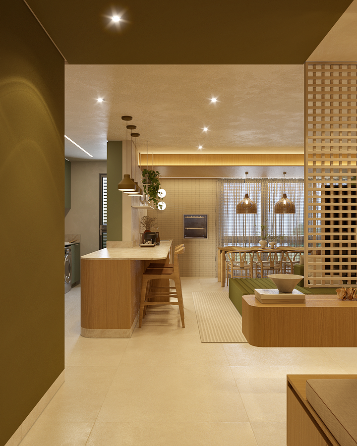 O ponto de partida foi a conexão entre a área gourmet e a sacada, criando um espaço fluido e acolhedor, perfeito para receber amigos e família. O uso de madeira, pedras naturais e tons de verde traz uma sensação de natureza para dentro do apartamento, equilibrando modernidade e aconchego em todos os ambientes.