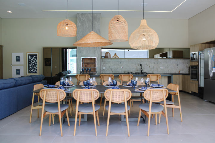 Inspirado no estilo praiano e natural, o projeto de interiores adota tons neutros e claros, combinados a materiais como madeira clara, pedra e fibras naturais. Essa paleta cria uma sensação de leveza, acolhimento e sofisticação descontraída, perfeita para uma casa de veraneio voltada à convivência e ao descanso.